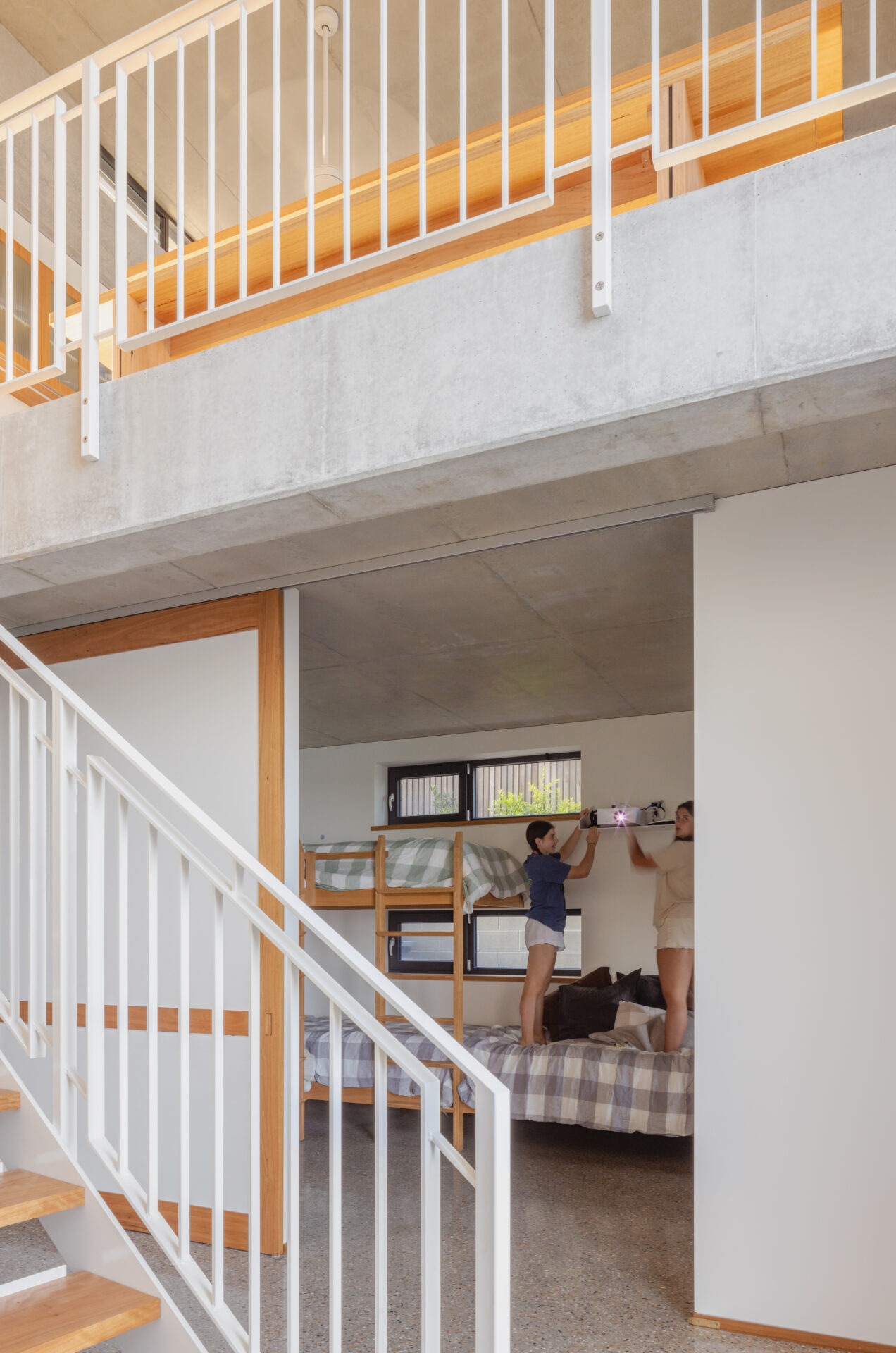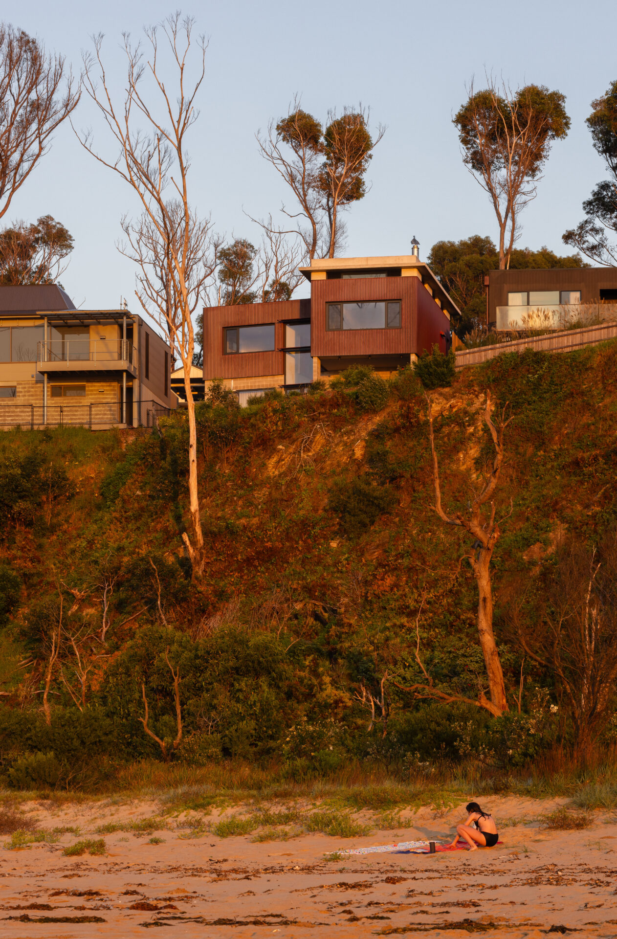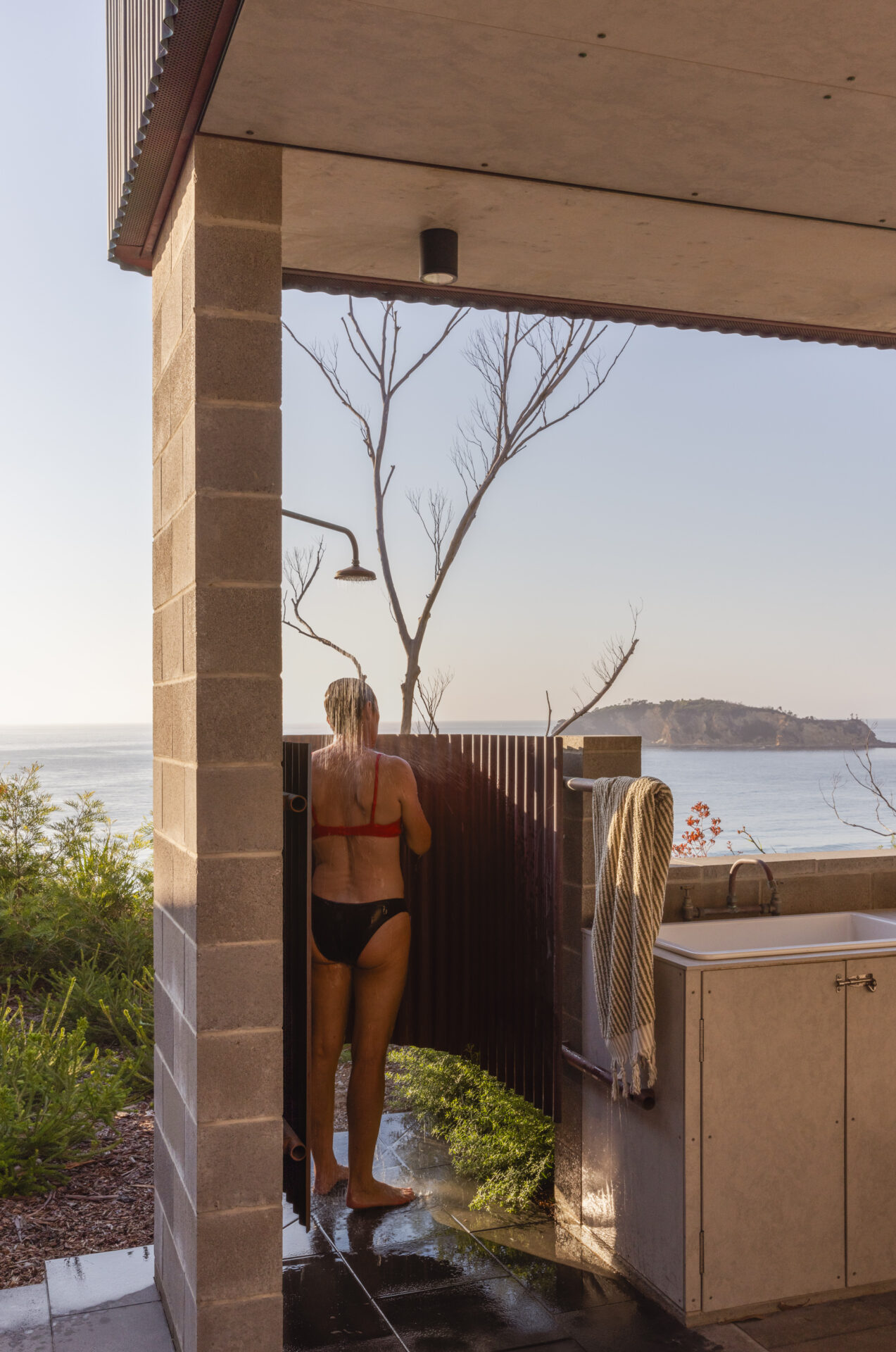 The bushfires of the 2019/ 2020 New Year period were devasting for North Rosedale. Very few houses were left standing. This house was built into this context- of a small coastal hamlet still traumatised by the loss, but prepared to re-build. Our approach was to go above and beyond the consideration of the BAL 40 rating and think about a house that could withstand multiple fires, significant climate change and the use of many generations of holiday-makers. If we were to condense the key ideas of this house into three words they would be robustness, comfort, joy. The clients say; “We are just amazed at the magic of a well designed space, it works well when there are two of us and equally as well when there are 10 or more. The space feels so much bigger than it actually is.”