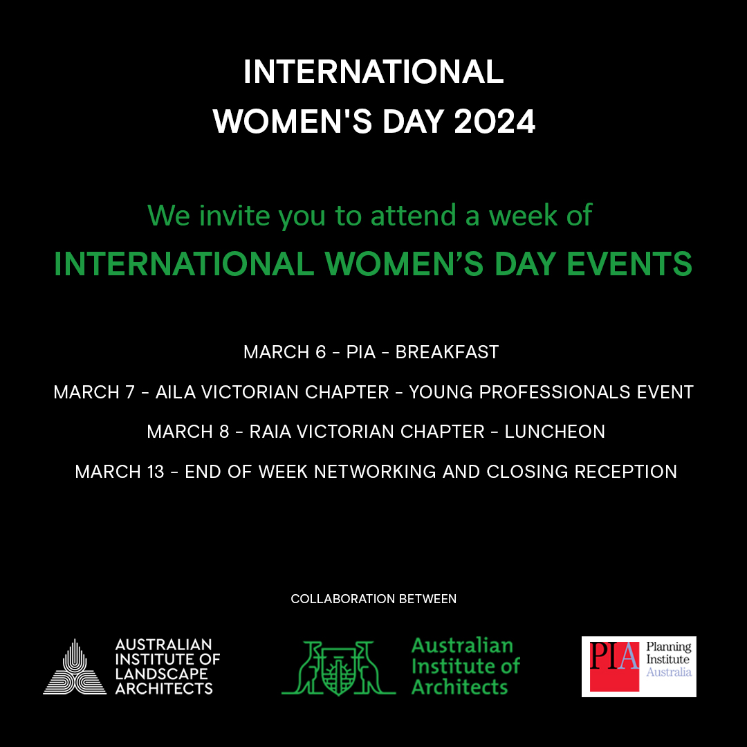 2024 International Women’s Day SAVE THE DATES! For the first time, the Victorian Chapter of the Australian Institute of Architects, Planning Institute Australia and the Victorian Chapter of the Australian