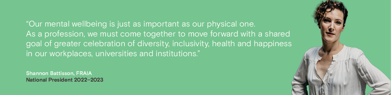 Wellbeing, with a new focus on psychosocial hazards is something that institutions, governments and the public are increasingly aware of, particularly in the workplace. Indeed, for some time this has been a point of contention within the architectural profession, prompting recent research into the wellbeing of practitioners and pervasive work practices.